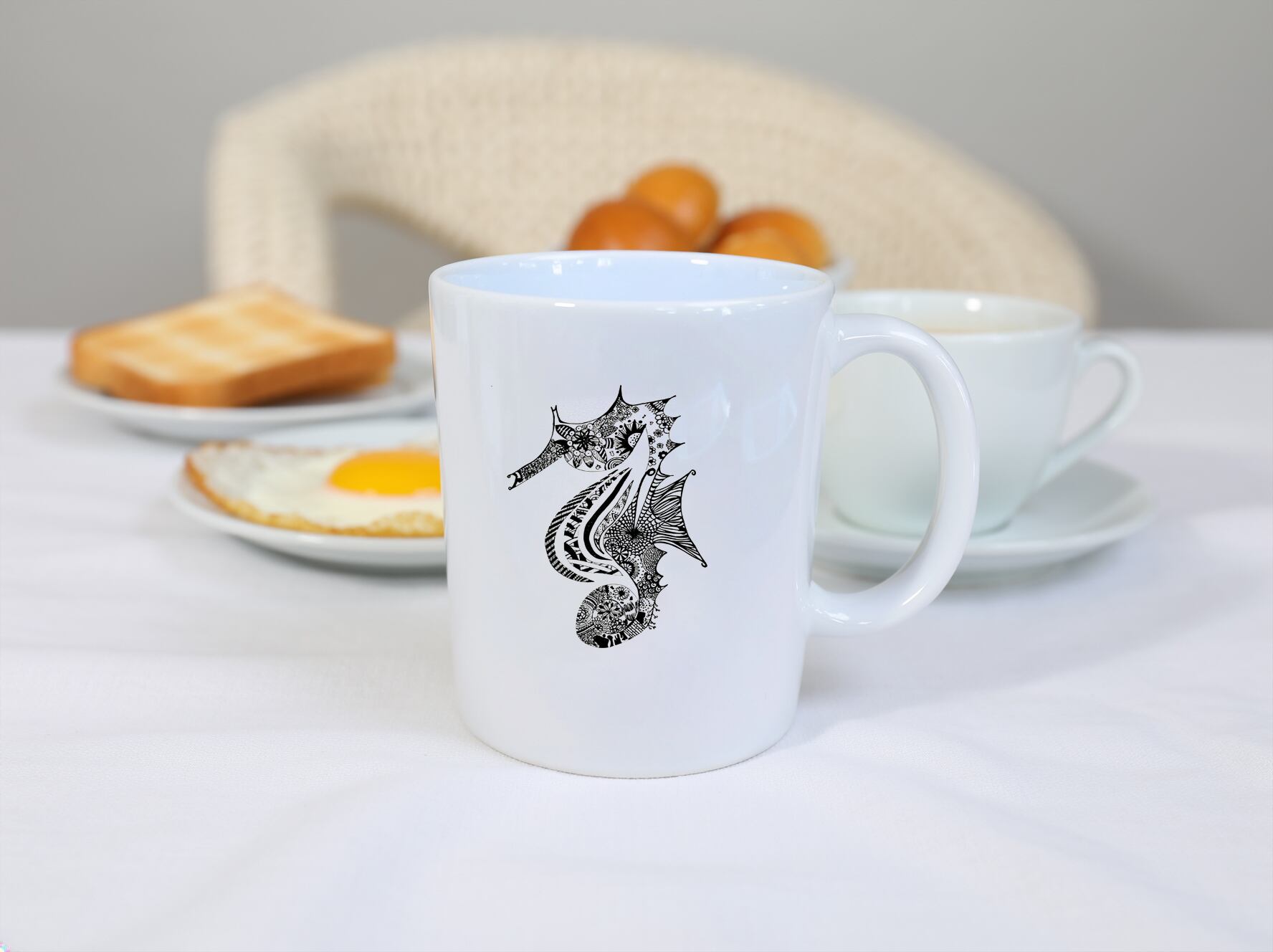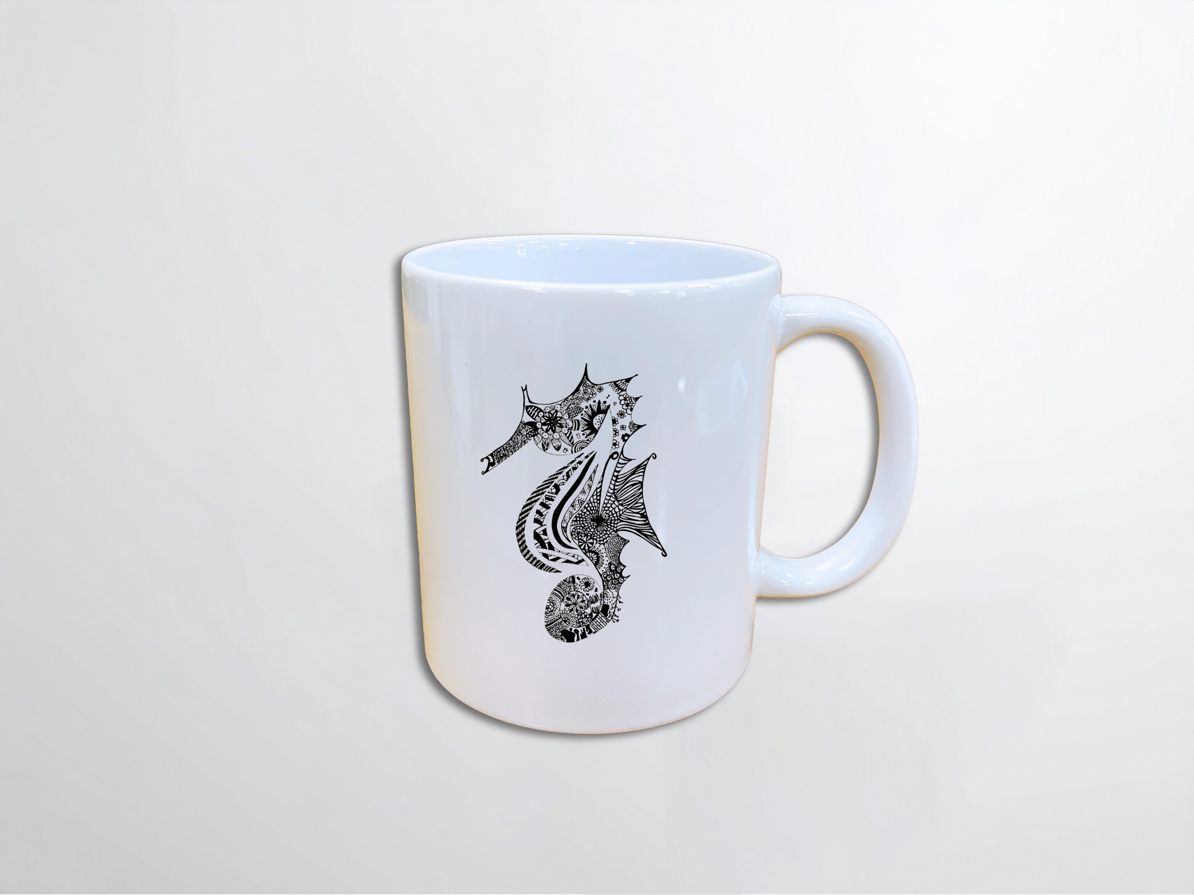 白いマグカップに転写シートで作品画像を貼り付けています。