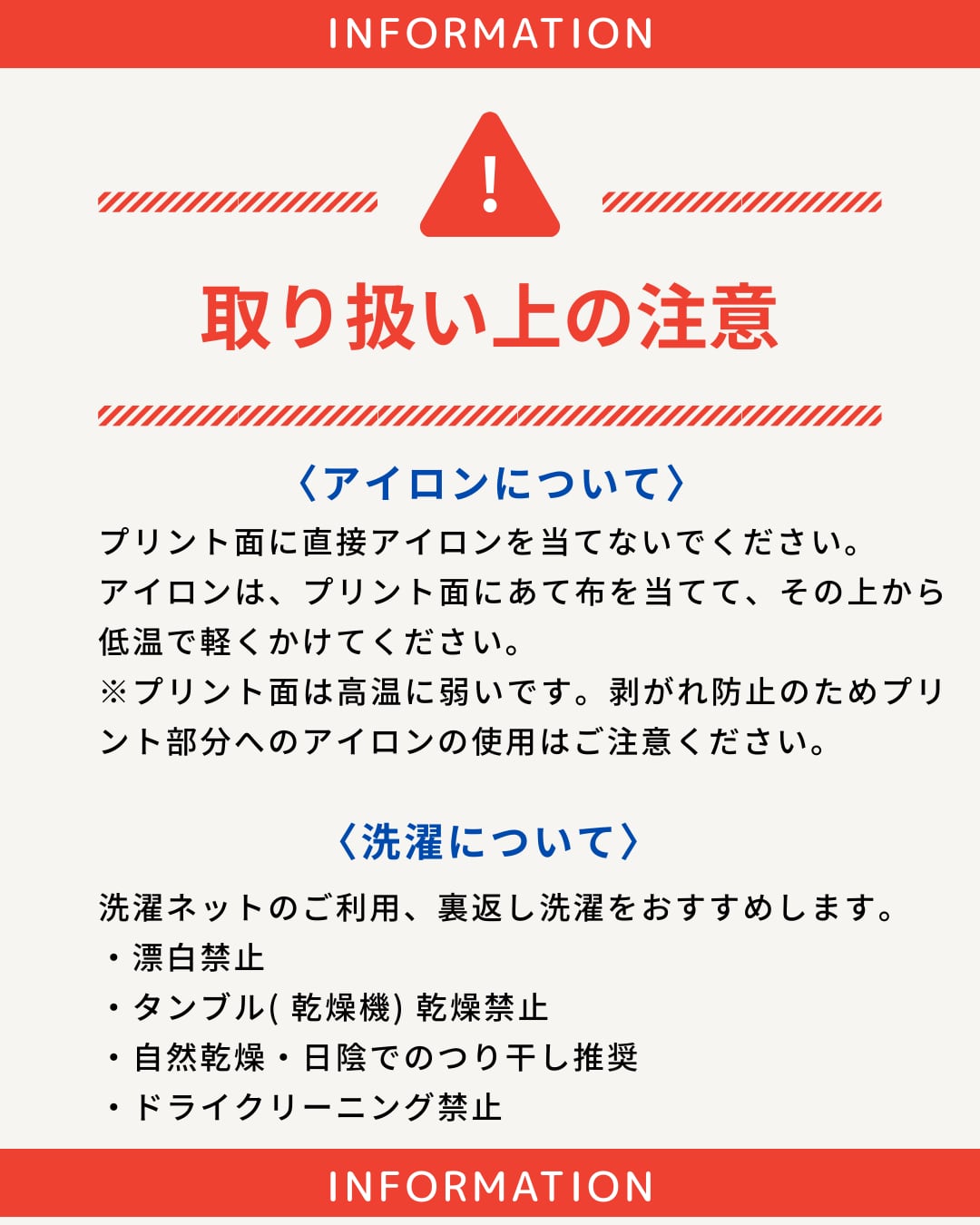 熱に弱いため、アイロンがけや乾燥機のご使用はお控えください。